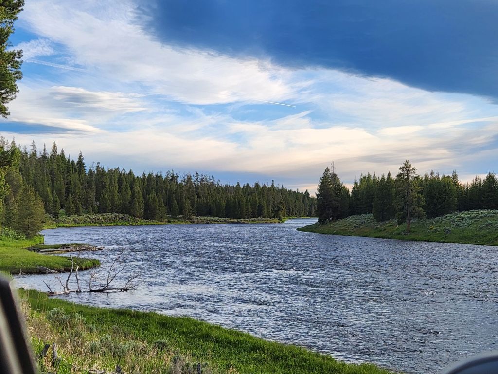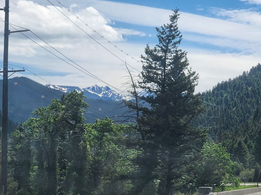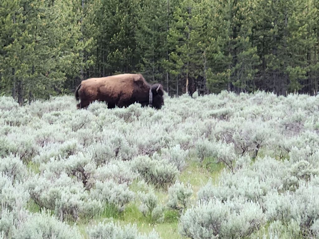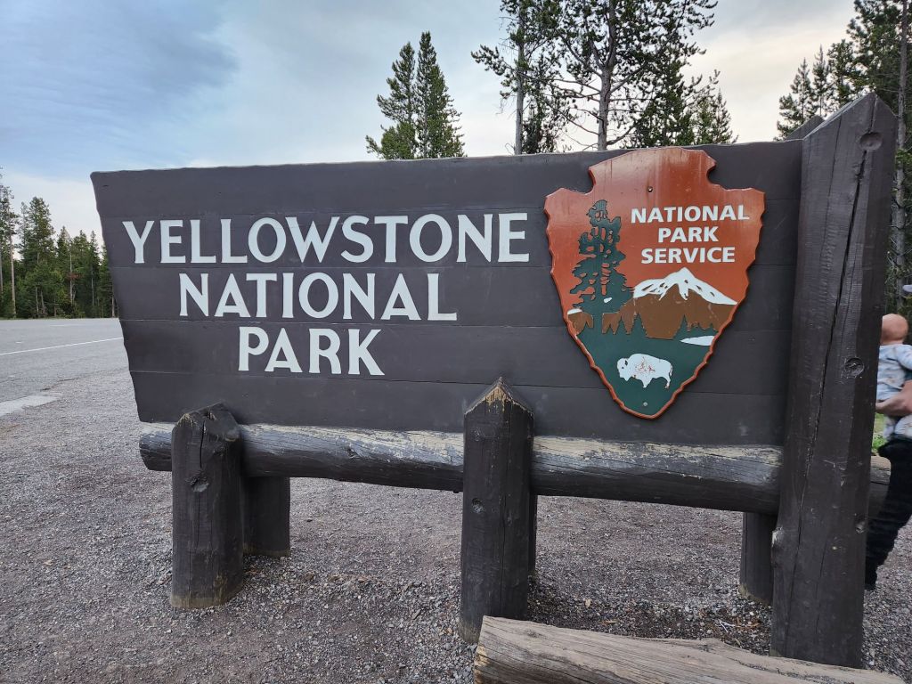 Sunday June 16th- Started the day with a Daddy’s day brekkie of sausage, eggs, and toast. Hit the road for Yellowstone. Saa Barney five’s car on the drive at a stoplight. The guy was super thrilled i was taking hia picture. Wind slowed us down quite a bit, but we arrived around 430 and were excited to go see some of the park. Joey had a run-in with a small Boulder and dented his truck up pretty bad but luckily still drivable. We now know why brush guards are on all the trucks here. In his defense, he was led right into the rock by campground staff. The whole thing was a bummer on the day. The kids had a blast playing with the camping neighbor kids while we got set up at the campsite. We decided we weren’t going to come this far without seeing yellowstone, so we went to the park and, to my delight, saw a little bison. We ended the day with some pizza at Wild West Pizzeria & Saloon. Obi fell asleep on Joey, which never happens. The pizza was good service, not so much, but all in all, I was happy because I saw a bison in yellowstone. Great falls, Montana next, last stop before Canada. -L