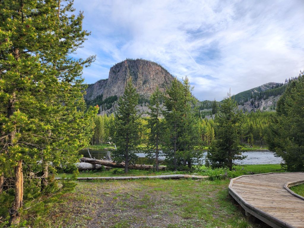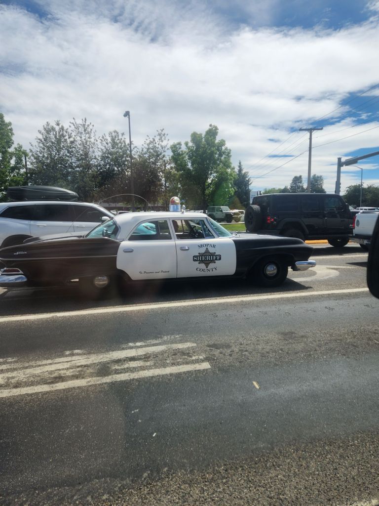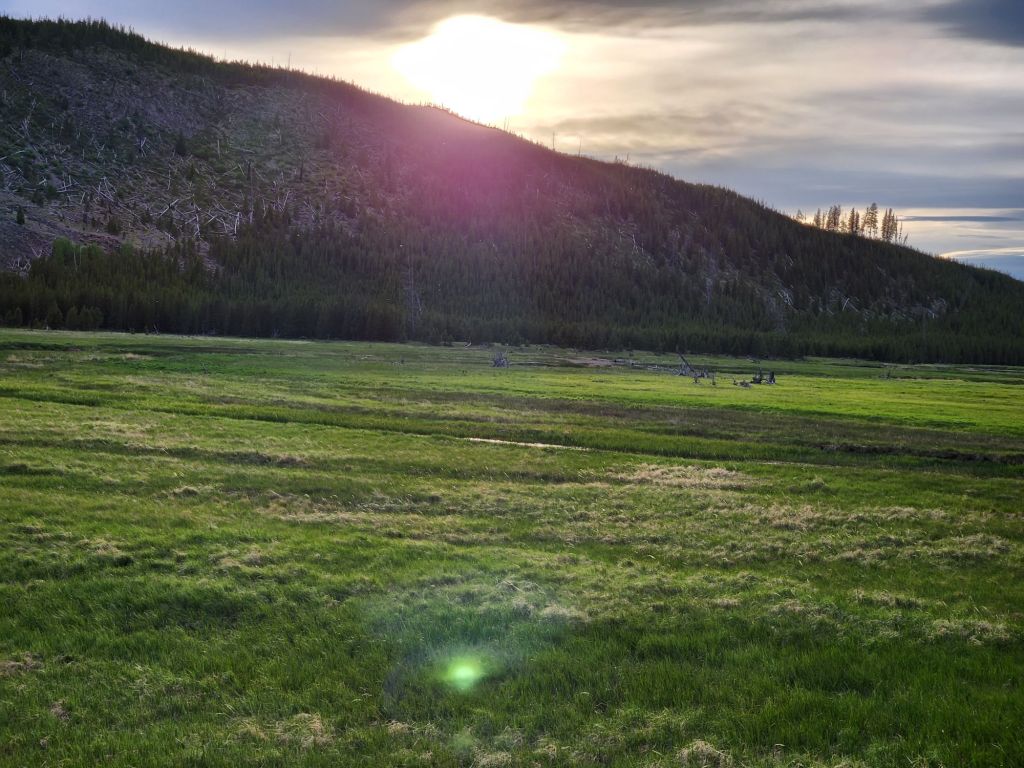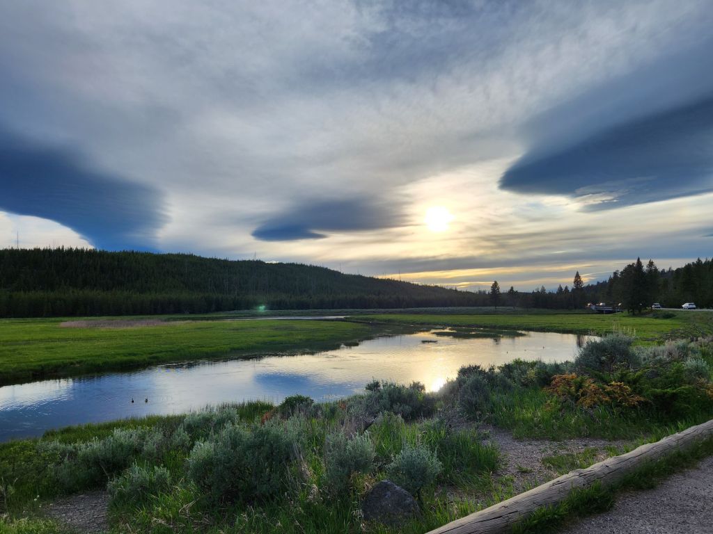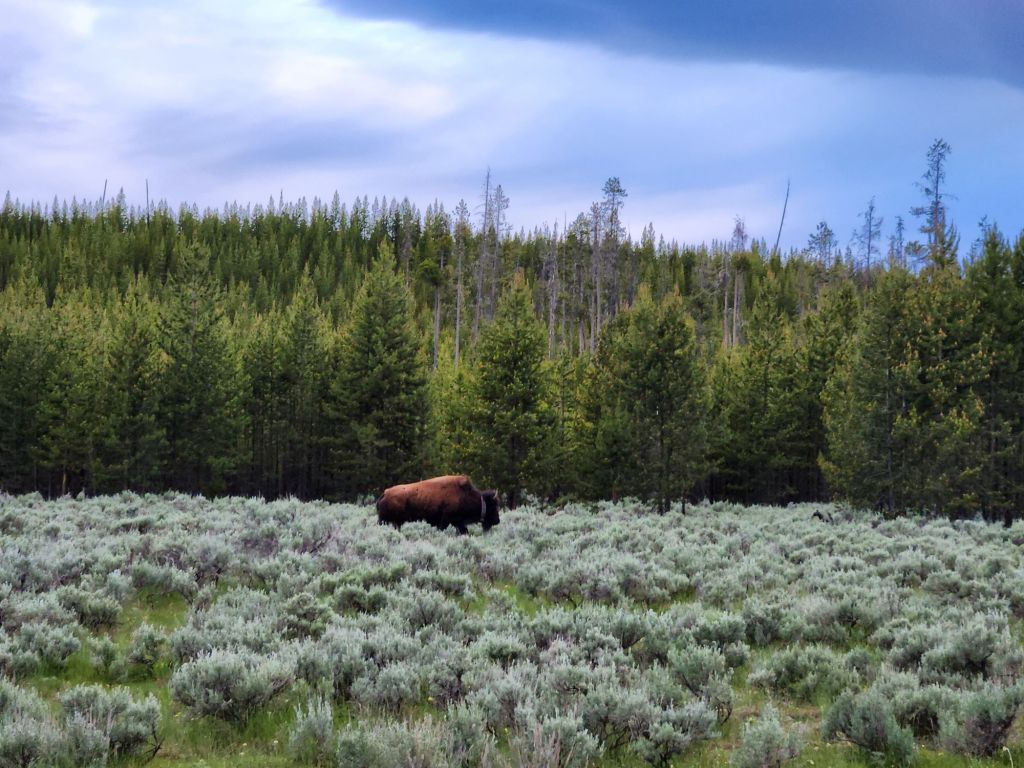 Sunday June 16th- Started the day with a Daddy’s day brekkie of sausage, eggs, and toast. Hit the road for Yellowstone. Saa Barney five’s car on the drive at a stoplight. The guy was super thrilled i was taking hia picture. Wind slowed us down quite a bit, but we arrived around 430 and were excited to go see some of the park. Joey had a run-in with a small Boulder and dented his truck up pretty bad but luckily still drivable. We now know why brush guards are on all the trucks here. In his defense, he was led right into the rock by campground staff. The whole thing was a bummer on the day. The kids had a blast playing with the camping neighbor kids while we got set up at the campsite. We decided we weren’t going to come this far without seeing yellowstone, so we went to the park and, to my delight, saw a little bison. We ended the day with some pizza at Wild West Pizzeria & Saloon. Obi fell asleep on Joey, which never happens. The pizza was good service, not so much, but all in all, I was happy because I saw a bison in yellowstone. Great falls, Montana next, last stop before Canada. -L