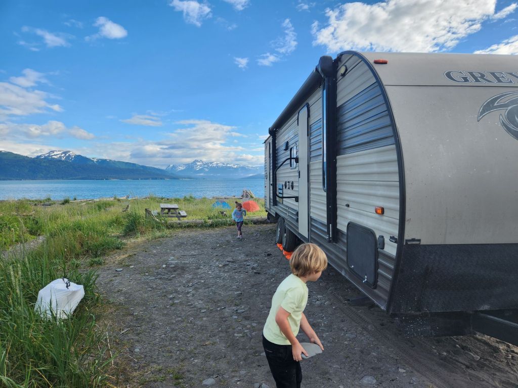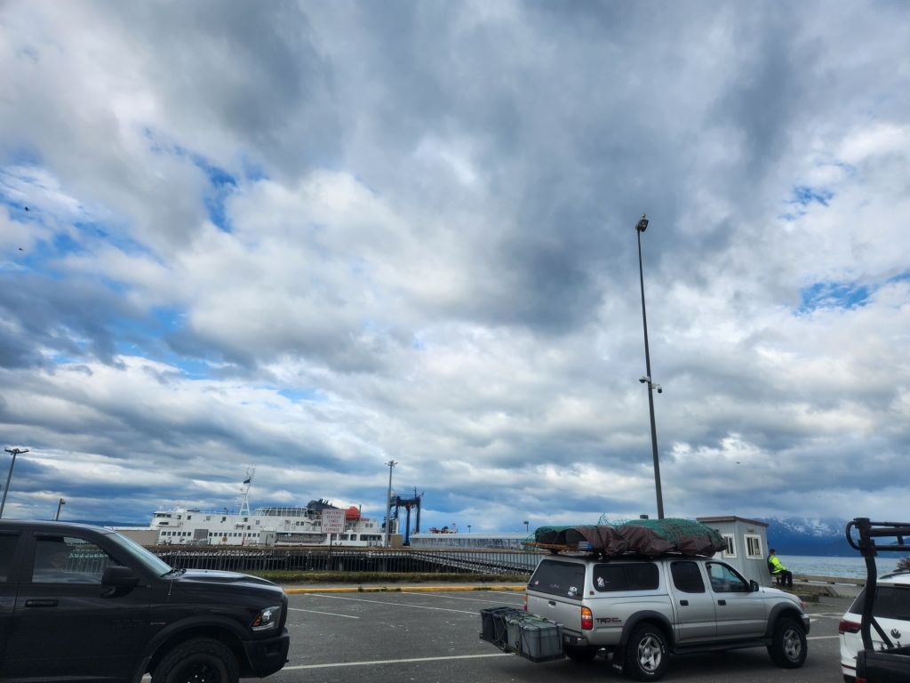 Made it to Homer to camp before the ferry. Homer is the cutest little fishing town. They call the one lane road to to the gulf “lands end.” Absolutely amazing views. Unexpectedly, I didn’t have hookups in our spot for the camper because we were in a beachfront spot. Our neighbor let us bum off their site since they were in a tent and not using the RV hookup, so that was nice. We spotted some seals swimming and walked the beach. Felt the most normal I have smelling the salt air. Homer reminded me a lot of Hatteras island on the OBX. We had to switch spots Sunday morning because our site was booked, but the ferry wasn’t until 845pm. In the process of moving, someone swiped my rocking lawn chair, which was a major bummer. We got everything set up with the puppies in the truck and headed to the ferry around 7 pm. They weren’t expecting our camper and how big it is due to the way the Coast guard booked it, but they were able to accommodate it (with a fee of course) and we made it on the ferry.